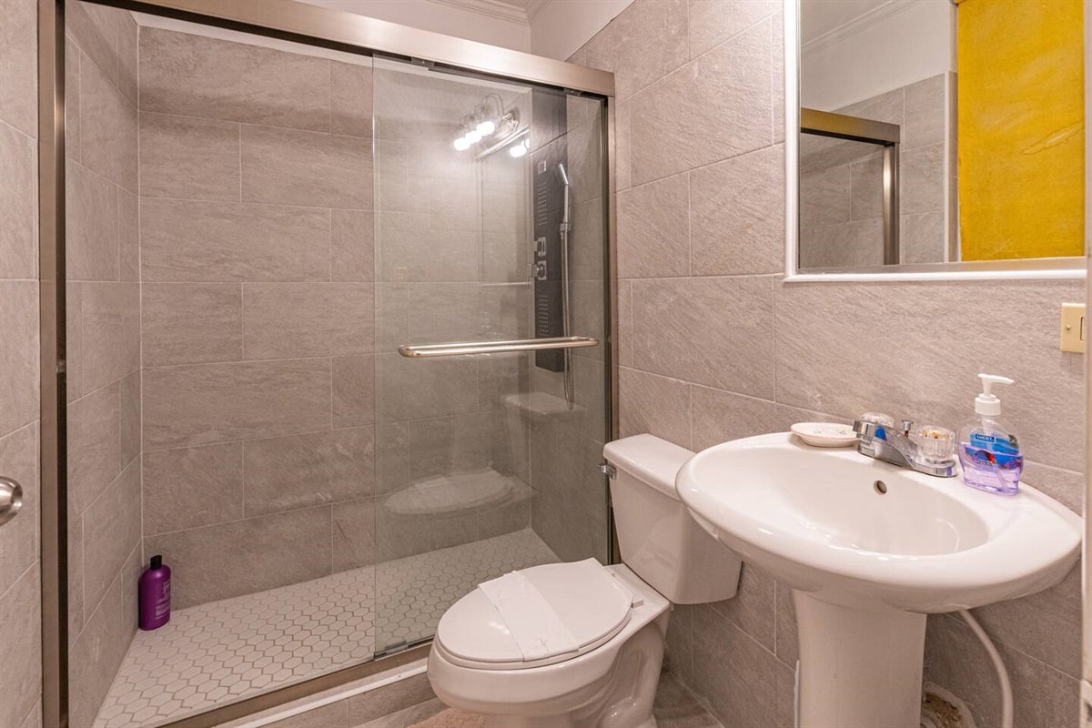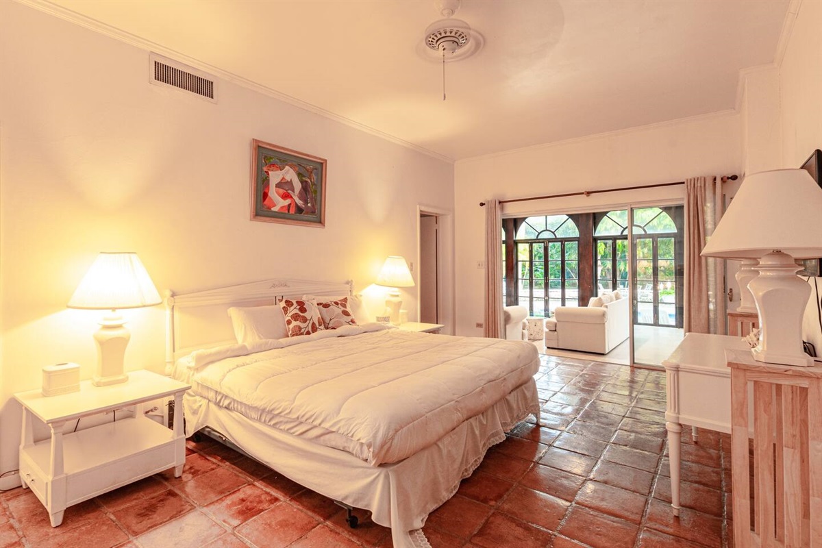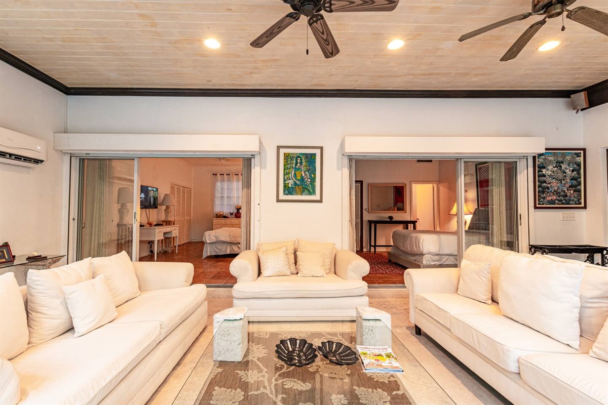 Two of the bedrooms are located on the ground floor, making them easily accessible for guests who prefer to avoid stairs. The other three bedrooms are located upstairs, offering stunning views of the surrounding garden and pool area. The upstairs area also features a cozy living room and a balcony area, where guests can relax and take in the warm Bahamian breeze.